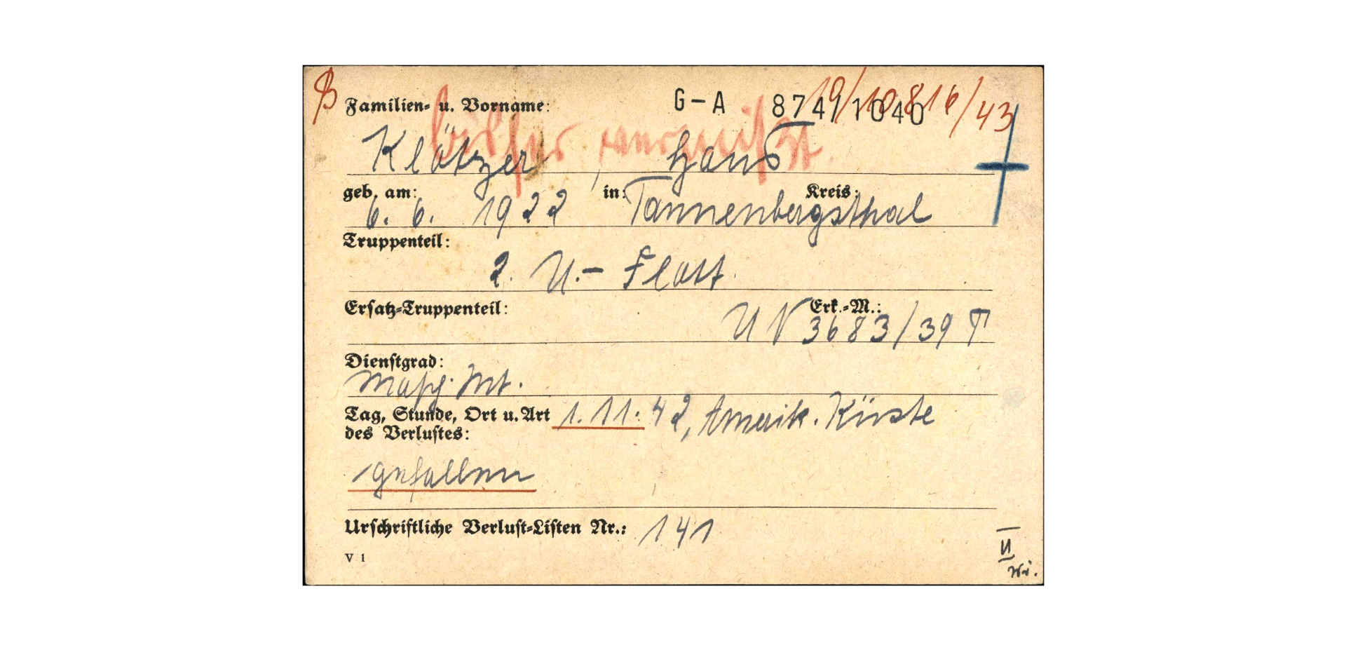 Hans Klötzer ist als gefallener Angehöriger der Marine namentlich entweder in dem U-Boot-Ehrenmal Möltenort bei Kiel an einer der Wandtafeln oder im Marineehrenmal in Laboe in einem dort ausliegenden Gedenkbuch verzeichnet. Nur in wenigen Einzelfällen konnten die Gebeine der auf See gefallenen Soldaten geborgen und auf einem Friedhof bestattet werden.